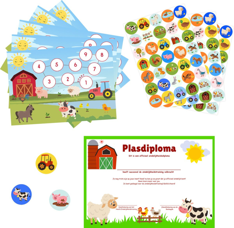 Dit beloningssysteem met boerderijthema combineert beloningskaarten, beloningsstickers en een plasdiploma. Door na elke succesvolle poging een sticker te plakken, ziet je kind de voortgang duidelijk en blijft oefenen positief en leuk.