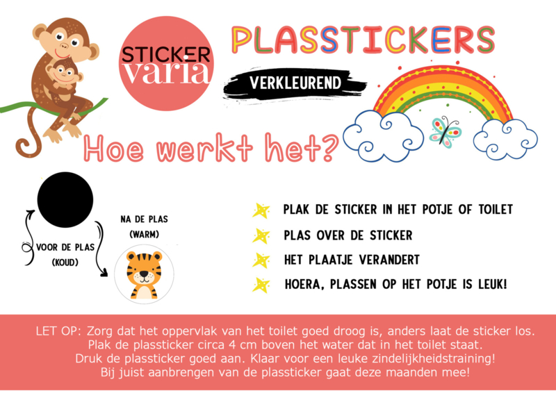 - 8 verkleurende plasstickers die lang mee gaan (als de eenvoudige instructies voor aanbrengen juist worden gevolgd). Plak in het toilet of het potje.