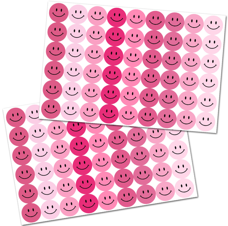 - 2 stickervellen met 54 stickers per vel (in totaal dus 108 roze smiley stickers)